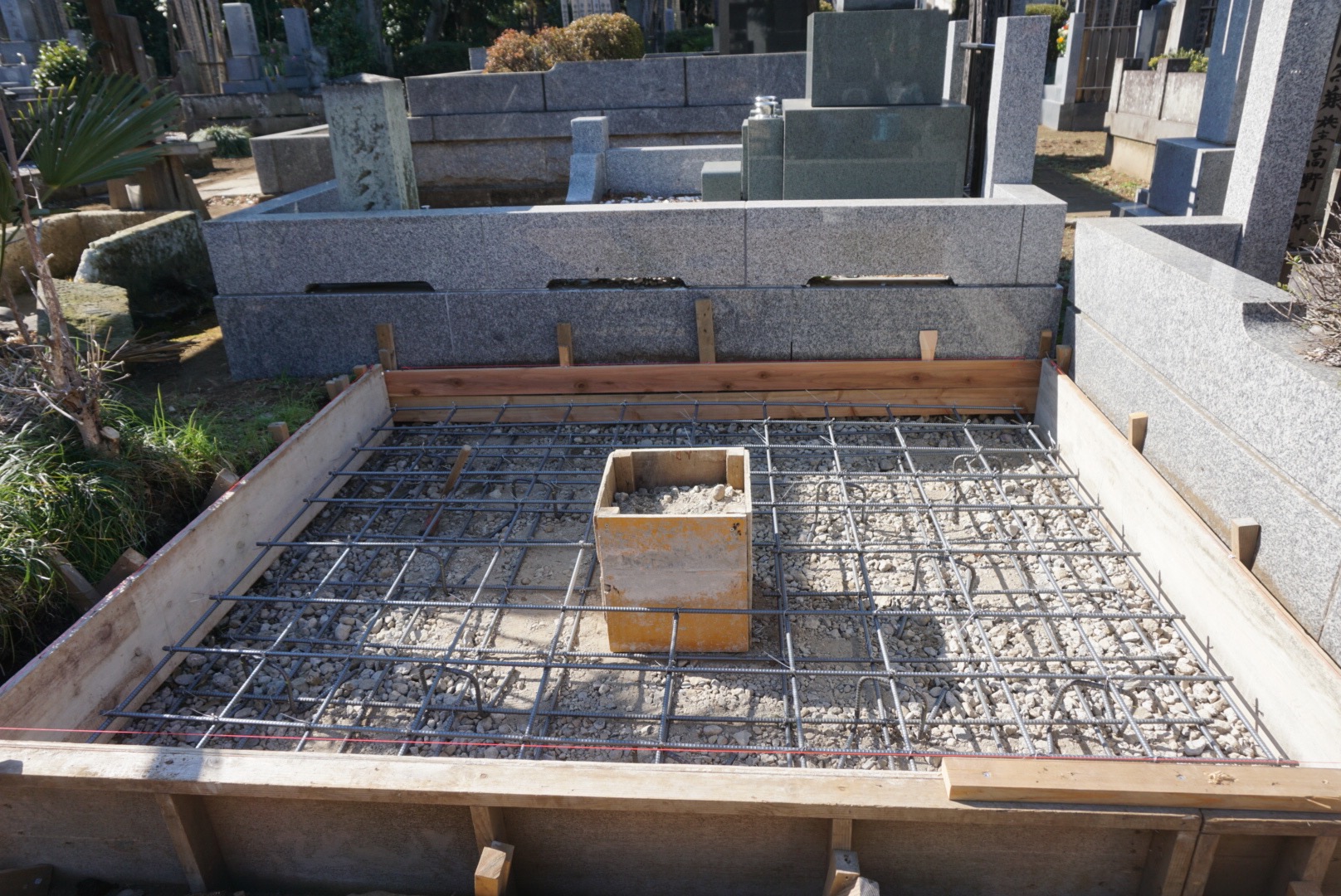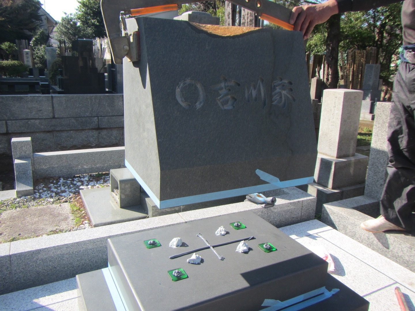 ということで、安全第一を最優先し、慎重に、且つスピーディーにお墓工事を進めてくれる職人衆を引き連れて、寺院墓所内でもひときわ斬新なお墓を創るためのお墓工事の様子はこちら。