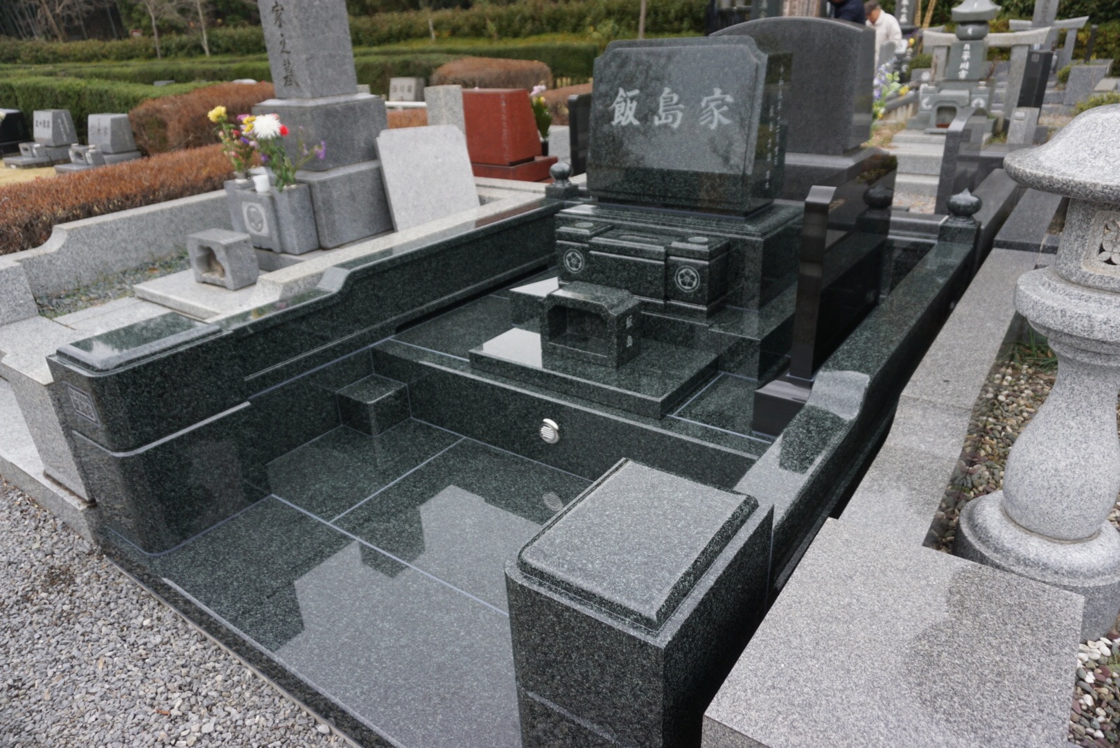 外柵と洋型石碑は、インド産のグリーン系の中でも一番品質の良い石種でのお墓作りのお手伝いをさせていただきました。
